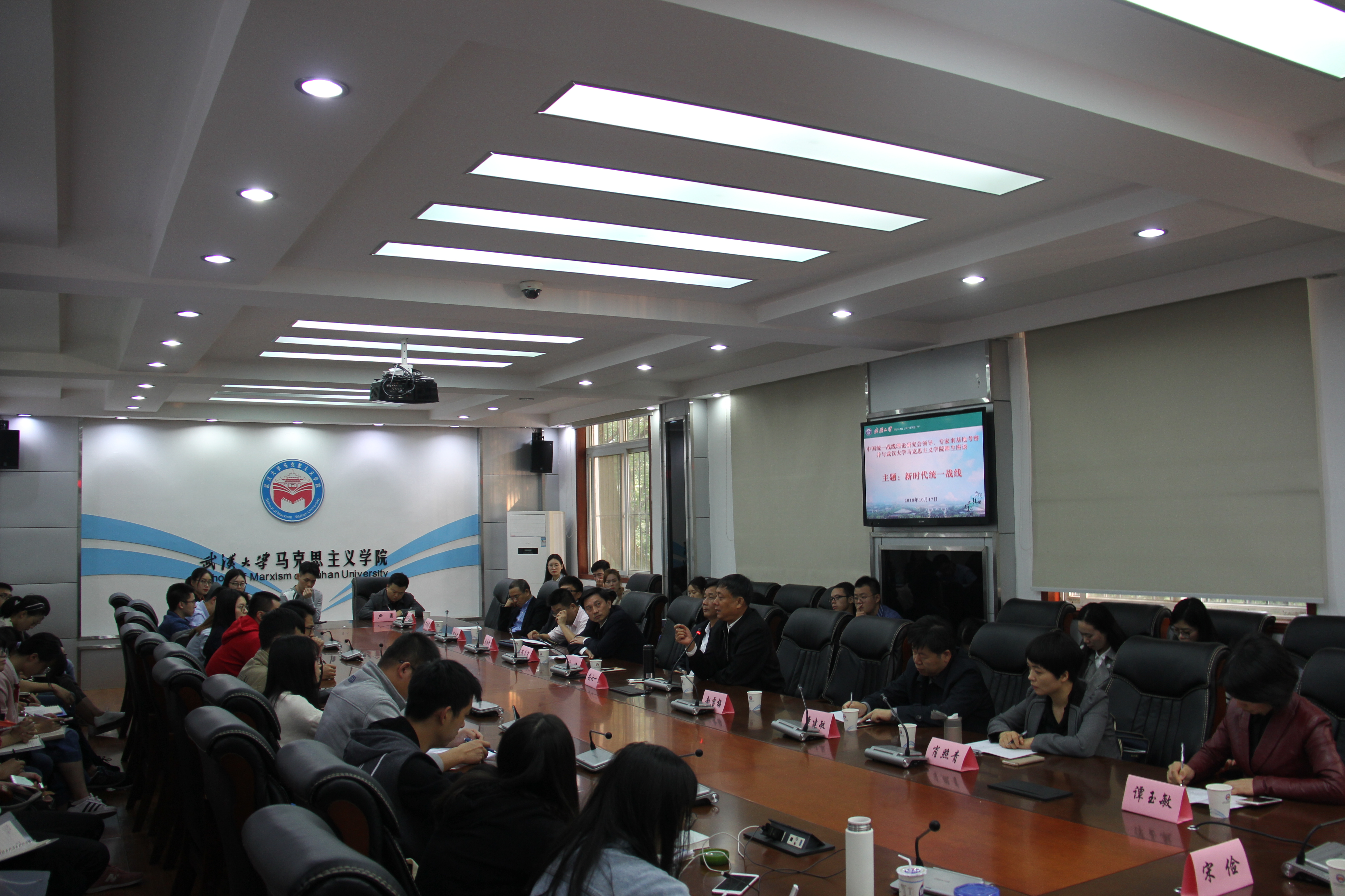 为推进“统战理论进高校、进课堂、进教材”工作,10月17日下午,在汉参加中国统一战线理论研究会2018年年会的中国统战理论研究会副会长、中国藏学研究中心党组书记安七一、中国统一战线理论研究会秘书长、中共中央统战部研究室主任张健、中共中央统战部研究室副主任章建敏、中共中央统战部研究室九处副处长肖照青及中共湖北省委统战部副部长陈昌宏、中共湖北省委统战部研究主任刘永峰等应邀来到必赢马克思主义主义学院,围绕“新时代统一战线”的主题与必赢部分师生进行座谈。必赢党委副书记赵雪梅,必赢党委统战部部长郭建中、办公室主任李莎莎,437必赢会员中心党委书记谭玉敏,437必赢会员中心副院长罗永宽教授,437必赢会员中心教师卢勇、林子荣等参加了座谈会。座谈会由437必赢会员中心教授、中国统一战线理论研究会党外知识分子统战工作理论研究基地副秘书长宋俭主持。